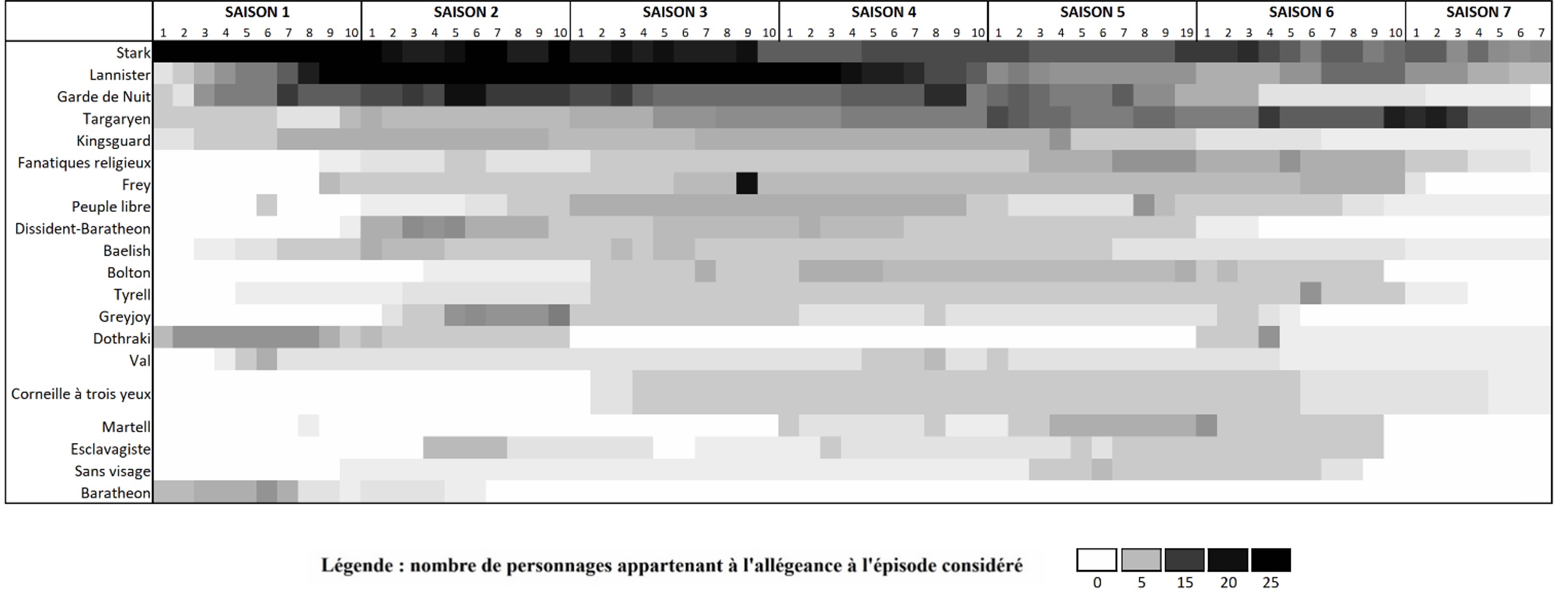 Dans ce calendrier (Fig. 1), vous retrouvez les 20 allégeances que nous avons recensées. Très peu d’allégeances sont présentes en début de série (peut-être pour ménager le spectateur qui voit déjà apparaître 50 personnages nommés dès le premier épisode !). En effet, certaines étaient encore inconnues en début de série : c’est le cas par exemple des Bolton. Les Stark sont nombreux mais sont fidèles aux Barathéon (eux-mêmes défendus par la Garde royale). On sent déjà venir l’entourloupe des Lannister. La Garde de Nuit défend le Mur contre une menace palpable. Les Targaryen sont les seuls à remettre en question le pouvoir central mais leur puissance dépend de celle des Dothrakis.