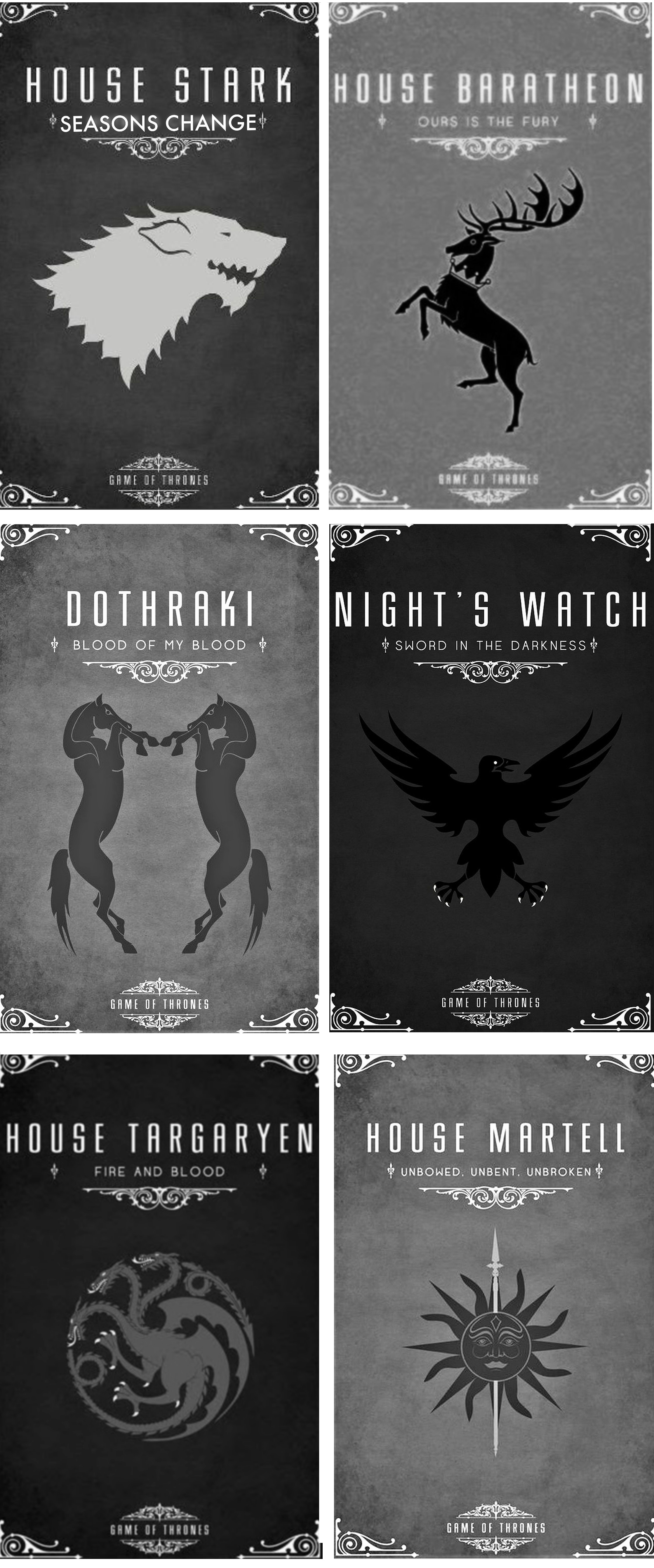 Stark : Main du Roi, Roi du Nord, tête sur une pique. On comprend très vite que c’est LA famille à suivre puisque dès l’épisode 1 le Roi Robert Barathéon se rend à Winterfell. C’est l’époque faste où les Stark sont les plus nombreux. Mais rapidement, ça commence à sentir le sapin (à la mort de Ned mais surtout à l’épisode 309 : les Noces PourpresQui est resté impassible devant l'épisode 9 de la saison 3 ? Celui-ci, surnommé les Noces Pourpres, s'intitule en réalité Les pluies de Castamère).
