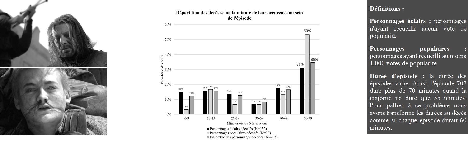 Tuer des personnages en fin d’épisode permet de lancer le générique en nous laissant bouche bée : « Ah ! ils ont osé faire ça... ». 35% des décès ont lieu dans les 10 dernières minutes de l’épisode contre seulement 12% dans les dix premières minutes. 53% des personnages populaires décèdent durant les dix dernières minutes. Puisque l’on vous a dit qu’il fallait leur offrir une belle mort !