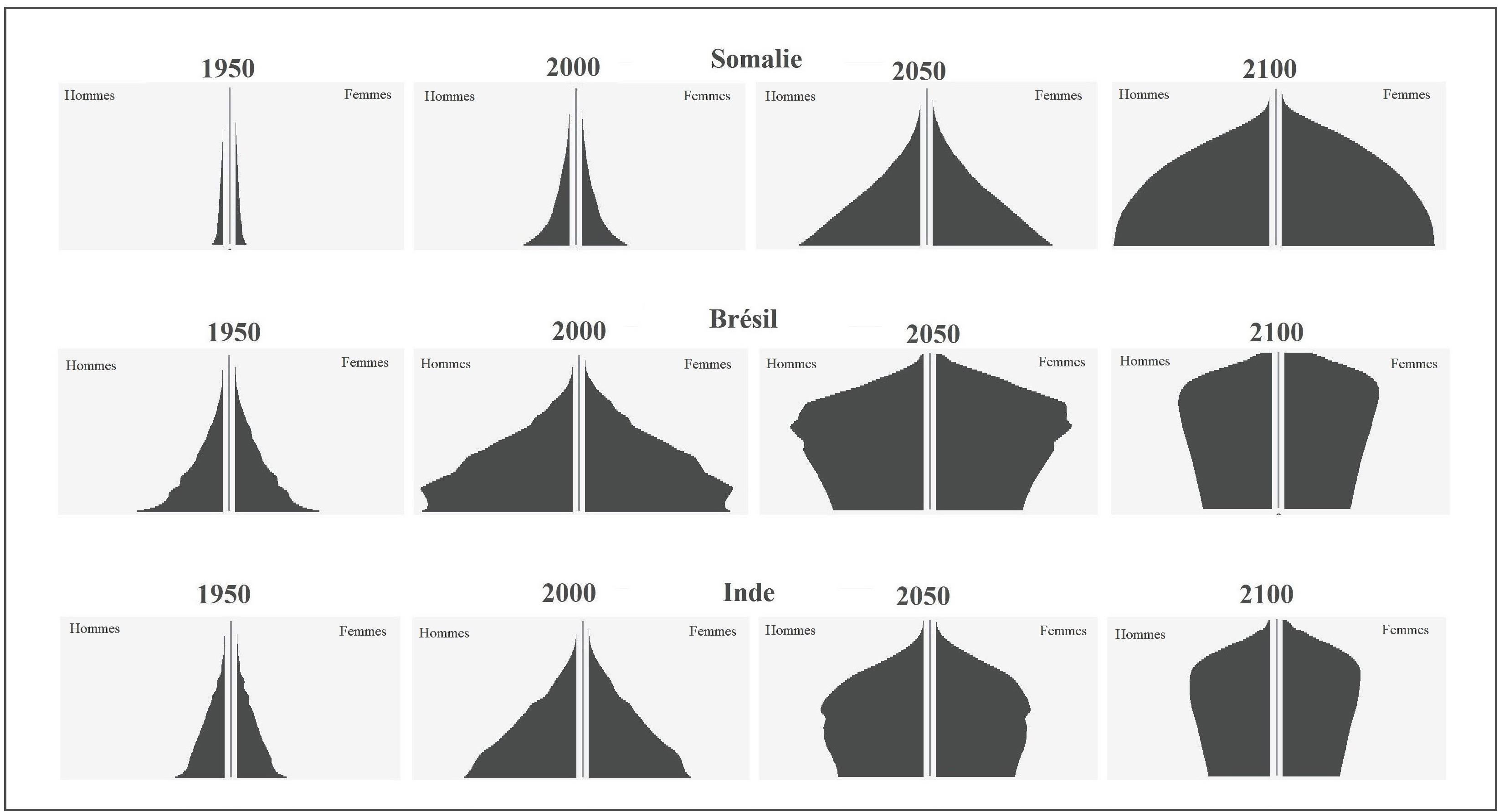 Fig. 4 : Pyramides des âges à différentes époques de la Somalie, du Brésil et de l'Inde
