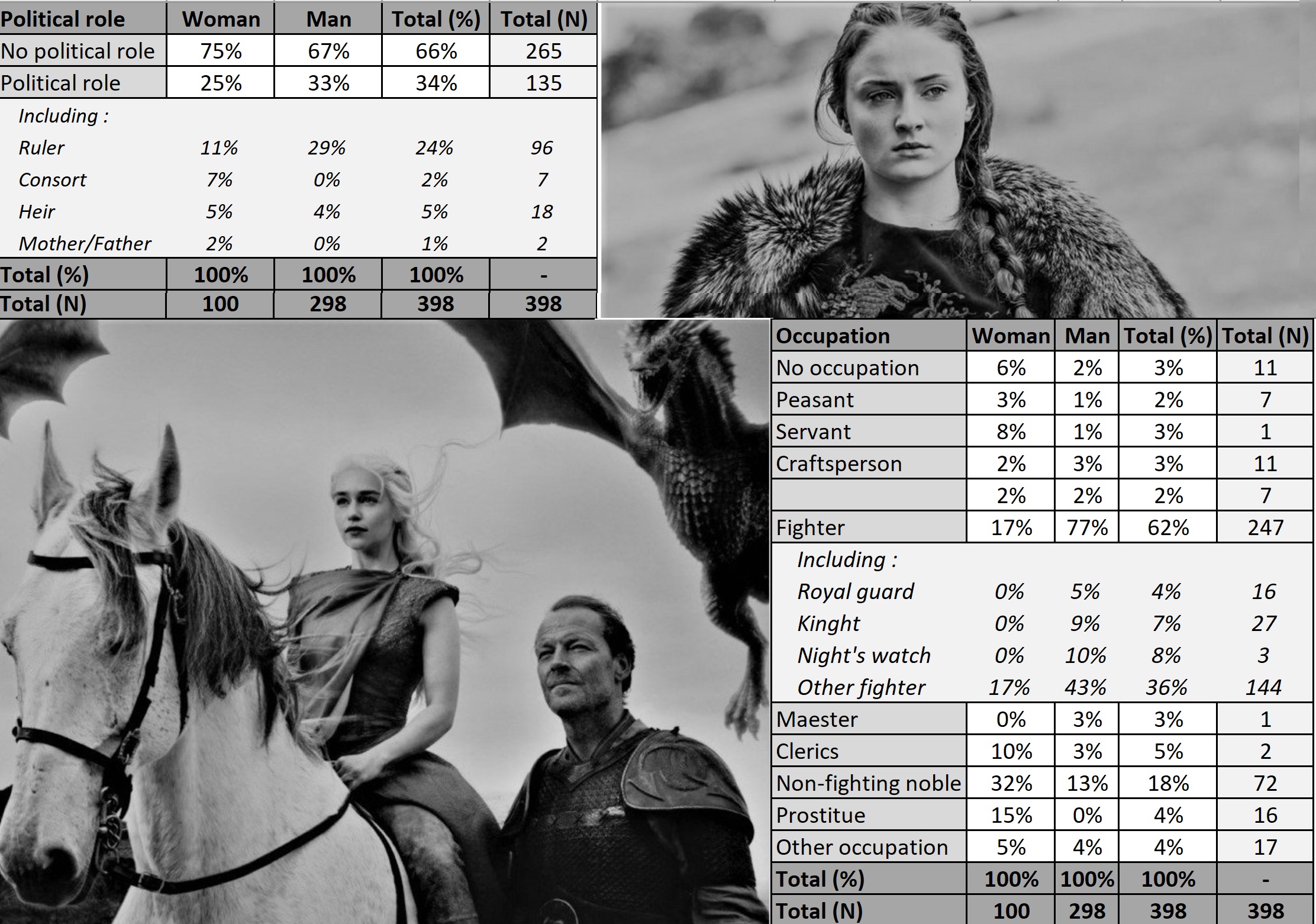 Therefore, isn’t it normal for the show’s universe, which depicts fights and power plays, to be male? There are 3 times more male characters! They are 5 times more likely to fight and twice as likely to play a political role. When you know these are also factors of mortality, this doesn’t sound quite as lucky… 1 “political woman” out of 4 is only so through marriage (in season 1, Cersei, Daenerys